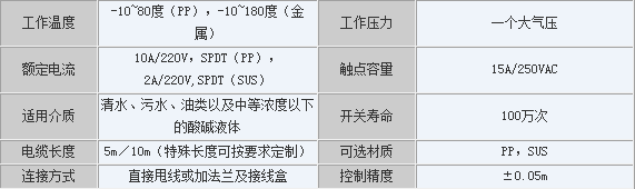 電纜浮球開關(guān)產(chǎn)品技術(shù)參數(shù):
